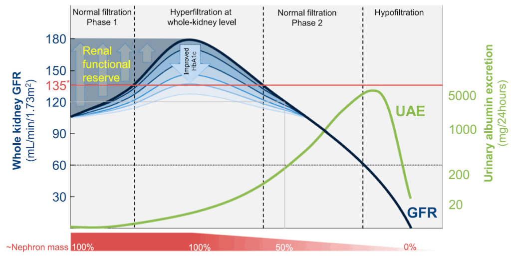 Chronische nierschade ontstaat altijd door een final common pathway: door destructie van glomeruli (bv. door diabetes, hypertensie, glomerulonefritis) ontstaat hyperfiltratie in de resterende glomeruli (toename van 'single nephron GFR') wat leidt tot geaccelereerde nierschade, wat vervolgens leidt tot proteinurie door druk/barotrauma op de podocyten, wat op zichzelf ook weer leidt tot verdere nierschade. Daarom zal bij een slechte klaring (eGFR <30 mL/min) ALTIJD verdere achteruitgang optreden.